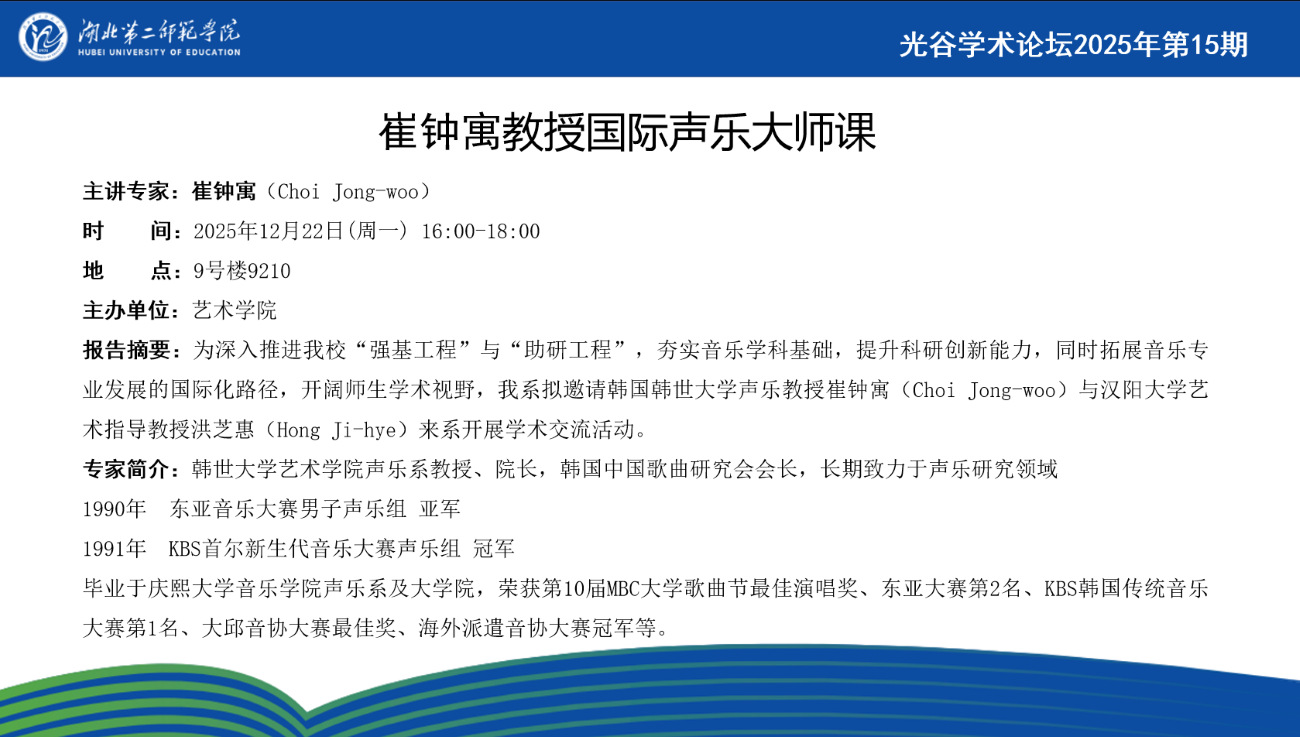 【光谷学术论坛预告】崔钟寓教授国际声乐大师课-ag捕鱼王官方网站